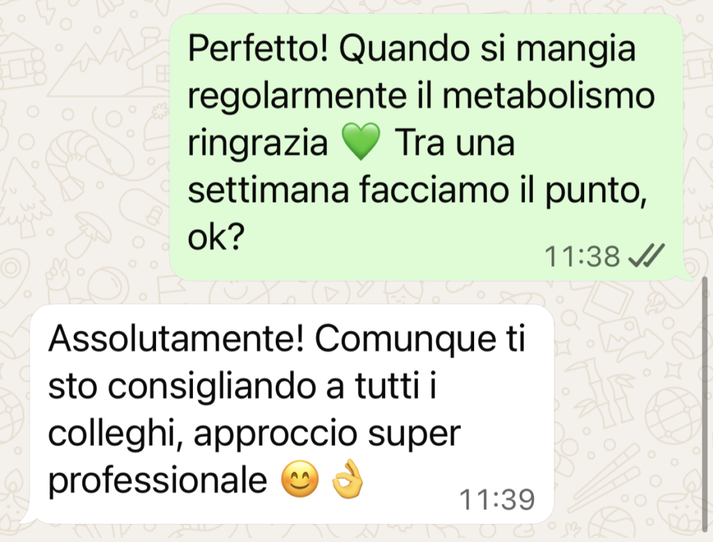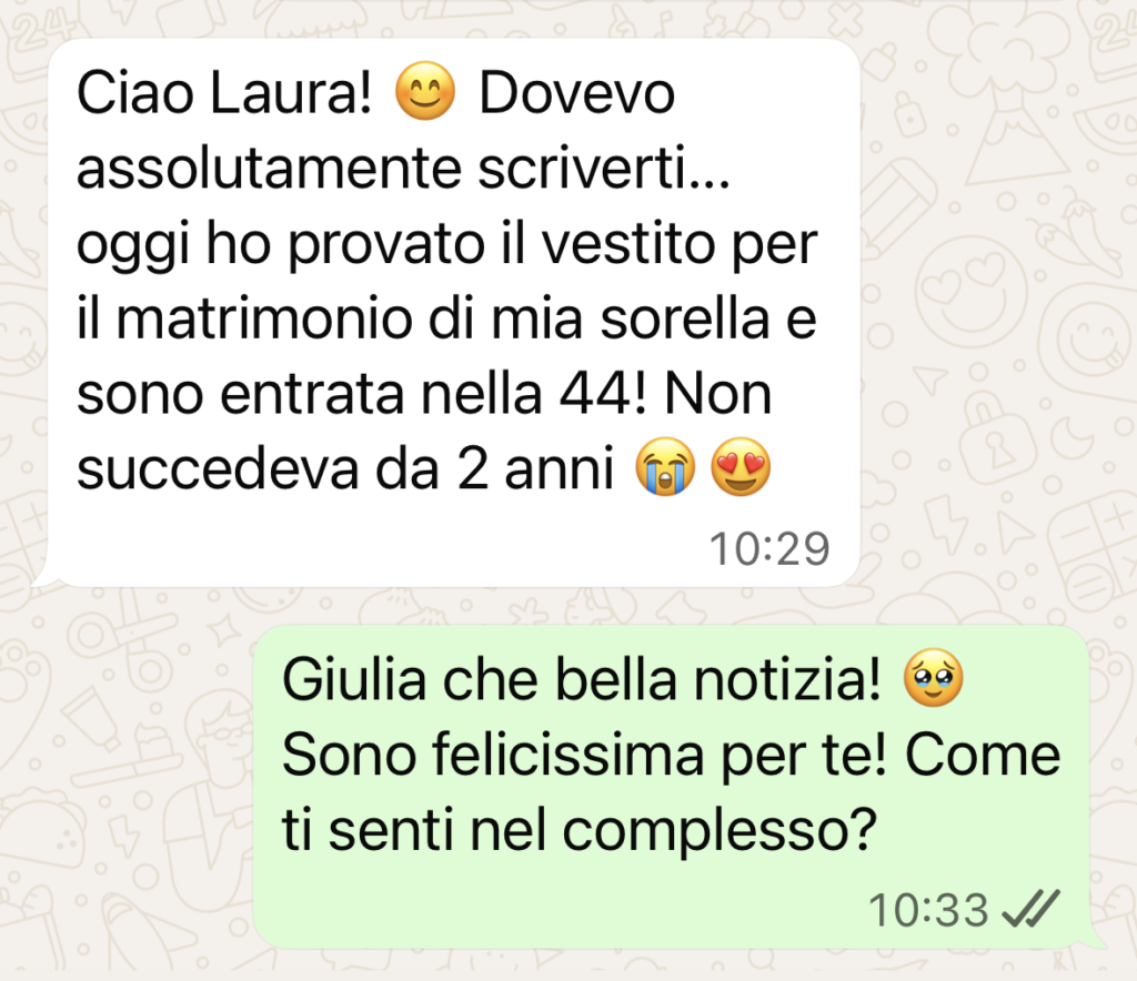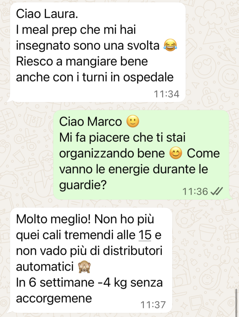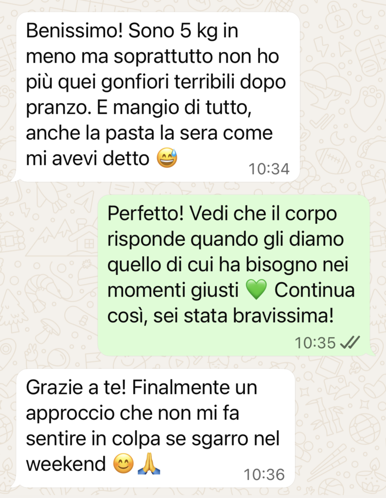 L’obiettivo è renderti completamente indipendente da me. Quando il percorso finisce, hai tutti gli strumenti per mantenere il peso raggiunto senza più bisogno di supporto esterno.